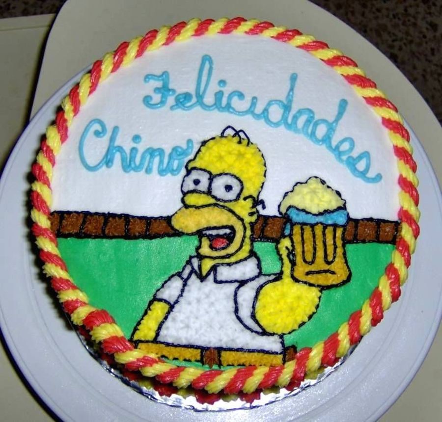 This was made for my neighbor's boyfriend, he turned 25 and is a big Simpson's fan...Vanilla cake with brandy syrup and Butter flavored Crisco Frosting. Rice paper was used to trace the Homer.