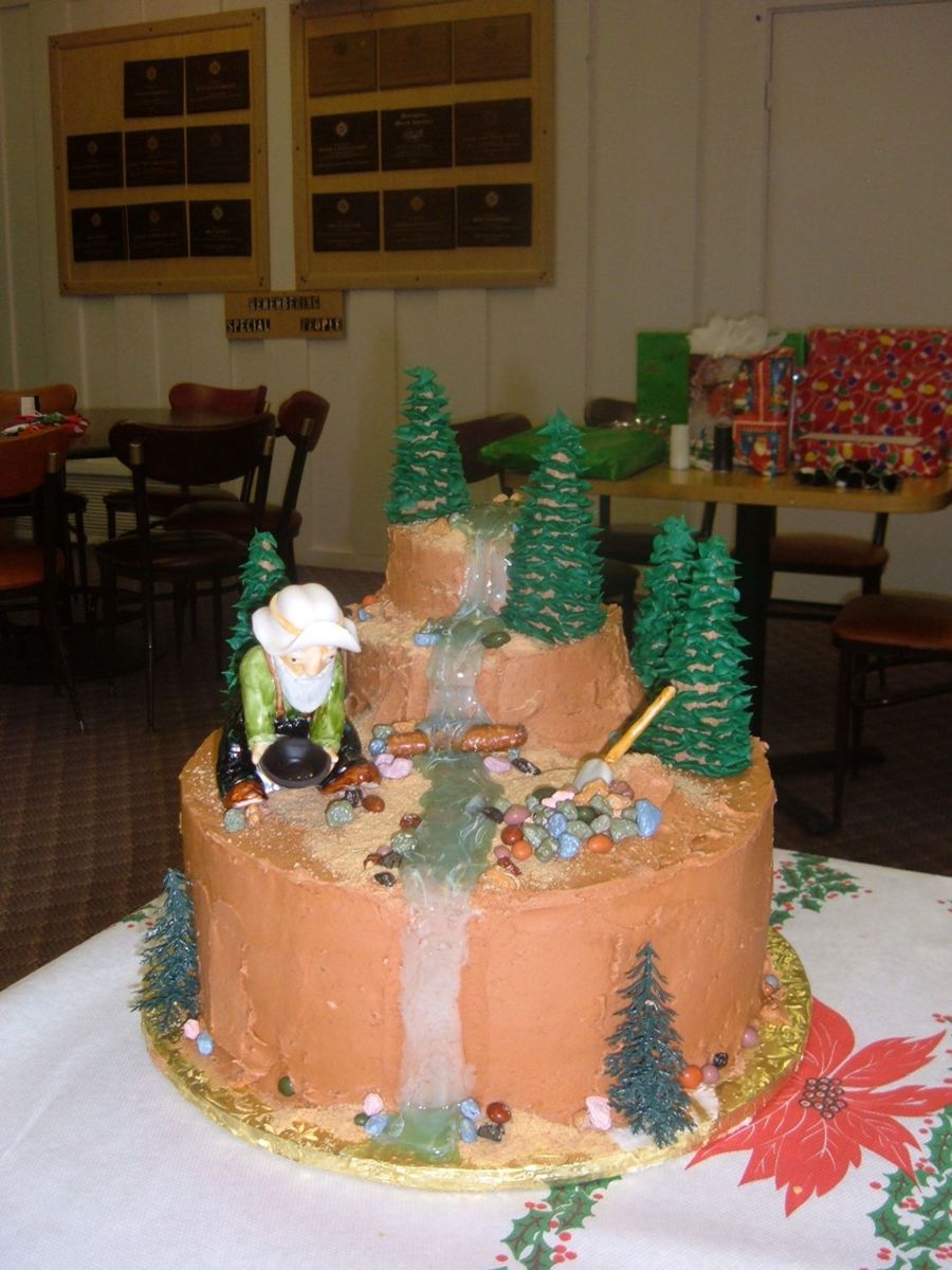 This was a cake for a local prospecting chapter's annual Christmas party. The prospector is molded out of gum paste, complete with gold pan and specs of gold inside.