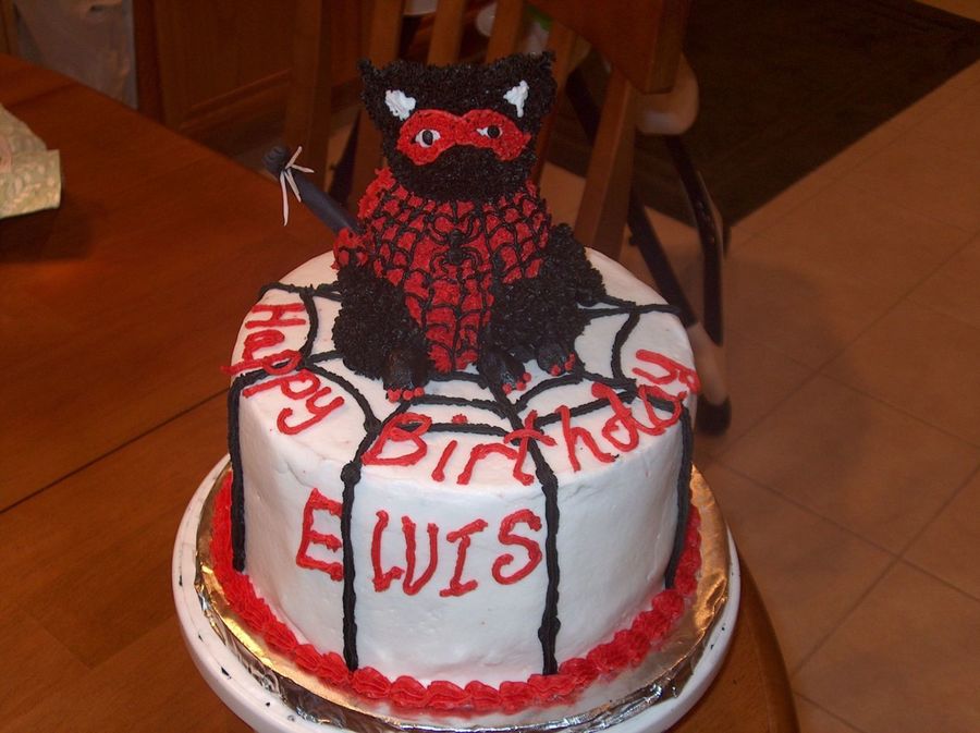 This is a cake that I did for my husband. I think he was just making up something to see if I could do it. I just started taking classes in June and he said all of my cakes were easy..so he maed up this cake for me to make. He said he wanted his cat midnight, dressed up in a spiderman costume, shooting a web out of his paw and sitting in a spider web. Well I did the best I can. For his paw I made it out of fondant. And those little white spikes out of his paw is suppose to be a web made of fondant.