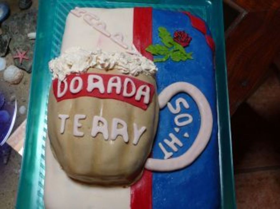 Cake for a msn that likes Blackburn Rovers (colours and logo) and Dorada Beer...Chocolate mud cake and Baileys cream,sp decor.