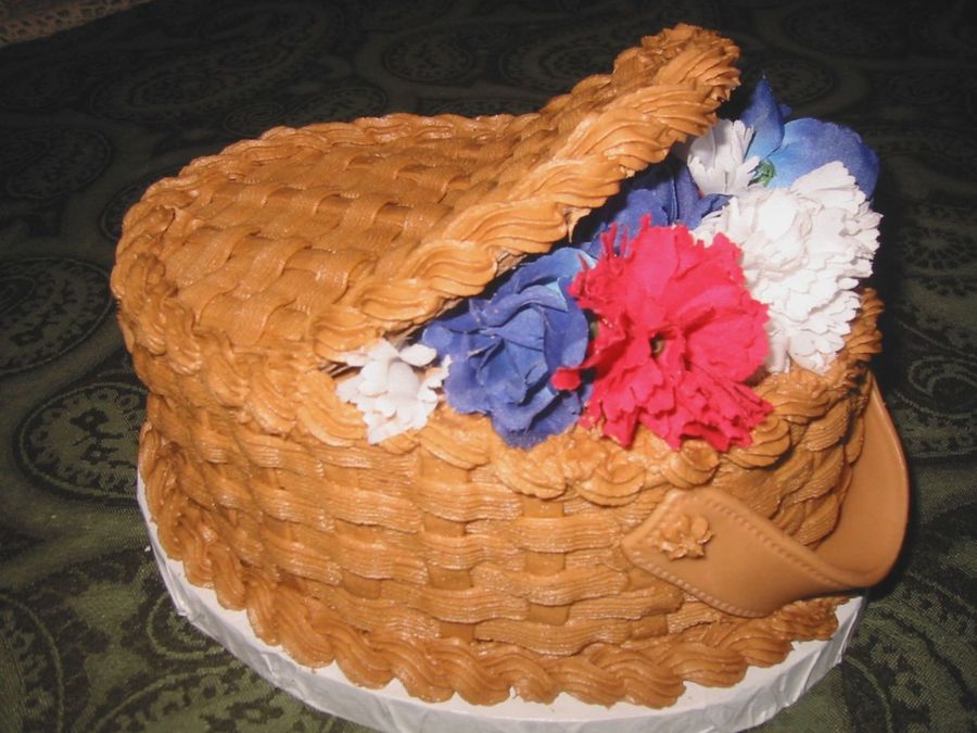 We had a church function this September with the theme of "Faith, Freedom, and Liberty. I just had to try one of these basket cakes ... FUN!!! I practically threw this together (cheated and used silk flowers) but even with the limited timing, I was very happy with the results. The best part was when one of the little girls kept telling this lady, "Look at her cake!!" and the lady got real frustrated ... "THERE IS NO CAKE!" (Priceless!!) Fondant handles.