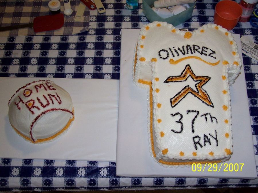 this was made for a man who loves baseball, its the shirt with his age and his name...and logo of is suppose to be the houston astros (done bad) and with if you look closely the water drop print is made of diamond designs like a baseball diamond (used paper towel method) the baseball on the side was to throw in his face. cake is all buttercream with marble cake inside.