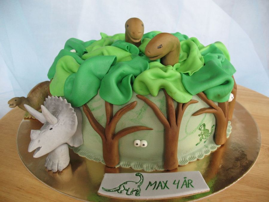 All dinosaurs are hand made in modeling paste. The trees are made in sugar paste.