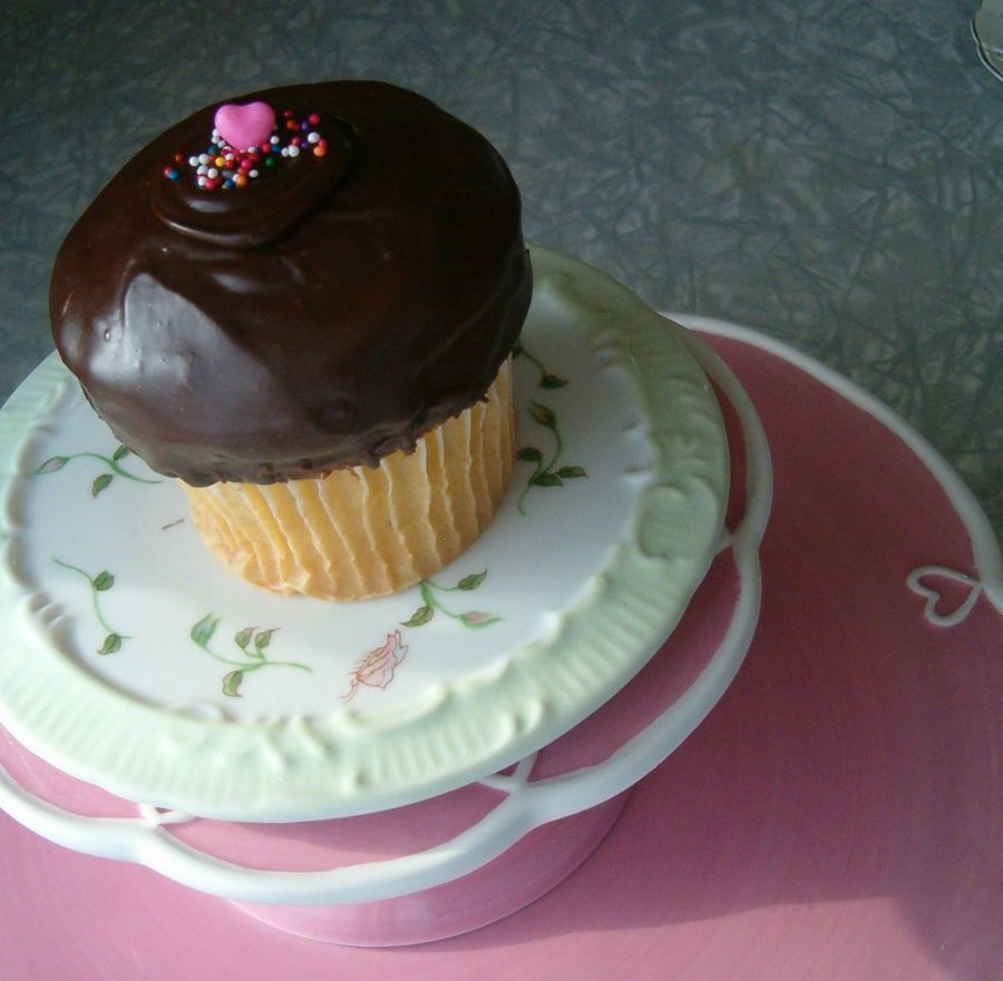 First try using the Wilton King-Size muffin pan. I like the tall sides on the cupcake top. Vanilla Butterscotch cake with dark fudge frosting. Frosting also injected into the middle!