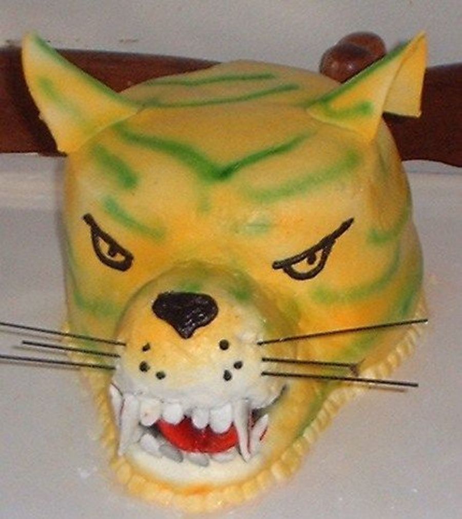 This is a 3 layer 8 inch round cake. It was carved and the muzzle is made out of styophom. The ears, teeth, and tongue are mmf and the whiskers are airbrushed spagetti noodles.