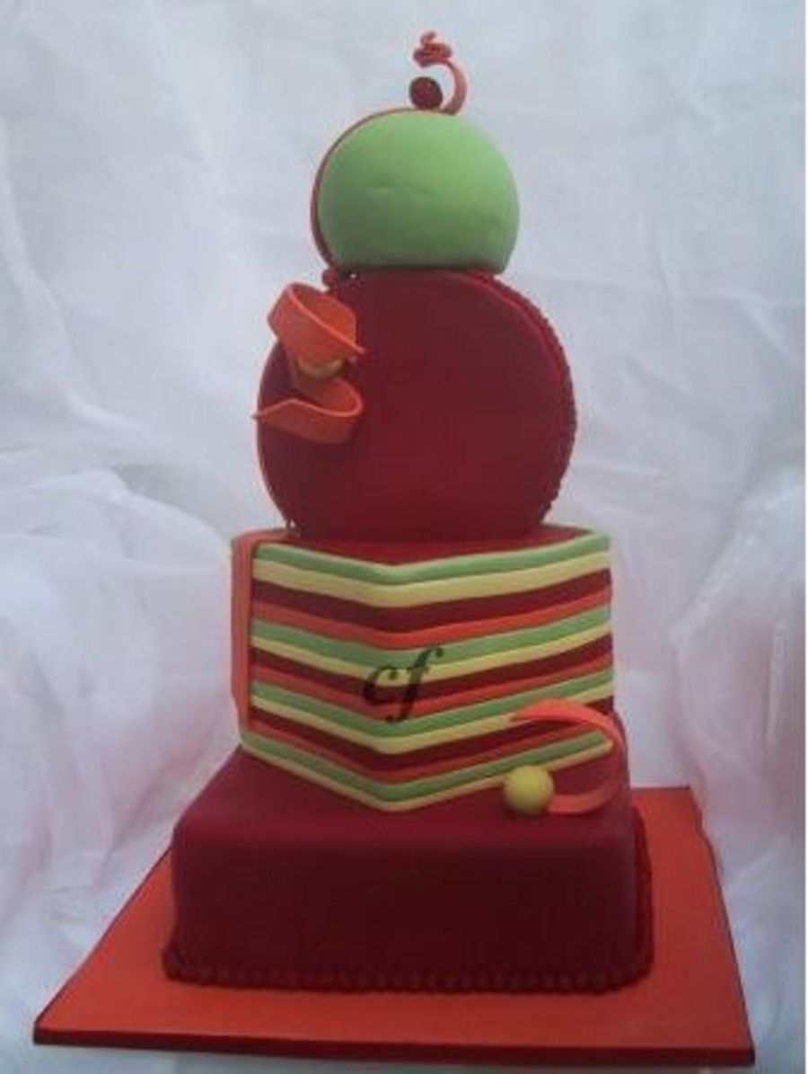 Funky is right .... that is sooooo cool! Your colours are fabulous together, and your abstract shapes accent it beautifully. Would love to know what size/shapes they were .. is the third tier a flat round on it's side? And how you would transport a cake like this?!! Congrats ... I think it's wonderful!