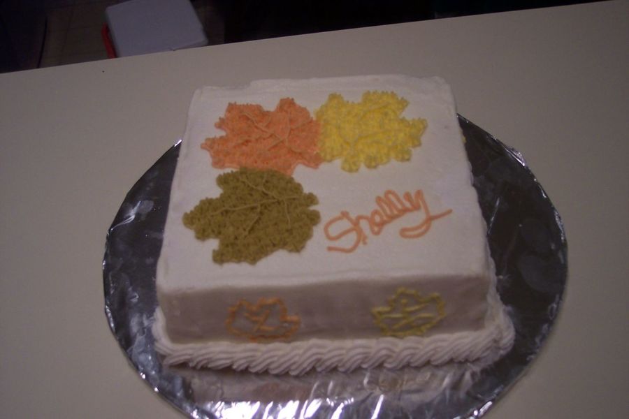 Working on a cake for my assistant. I tried making fall leaves, but don't like them now that they are filled with stars. I'll have to try another fill method next time. Orange leaves turned out a bit peach-y, too. WASC with buttercream, filled with chocolate buttercream. Tastes great!
