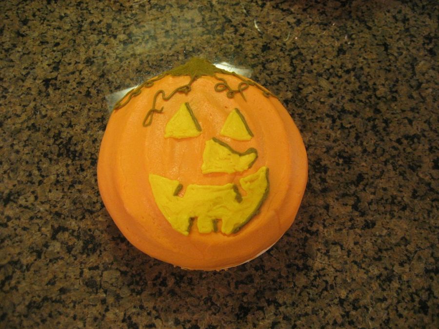 I had half an hour to make this one...a surprise for my kids who were playing at the park after a trip to the pumpkin patch. Six inch orange cake, filled with strawberry buttercream. Iced in buttercream.