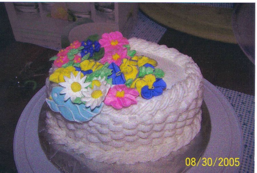 This was a practice cake. It was a lot of fun to do. Flowers are royal icing and bird is color flow.