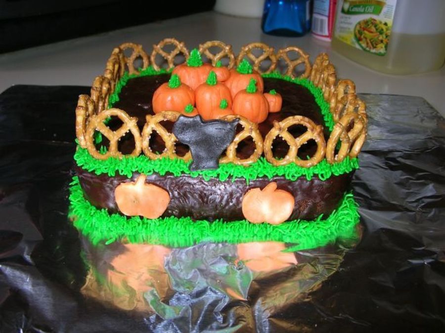 The cake is french vanilla covered in chocolate ganache. The pumpkins are made from candy clay with buttercream stems. The black cat is made from fondant.