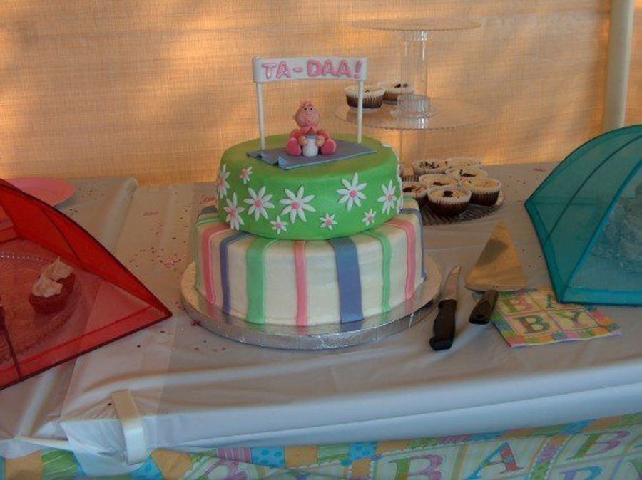 Made this for my sister-in-law's baby shower. It matches the invitations we made. B/C icing with fondant accents, baby and sign made of gumpaste.