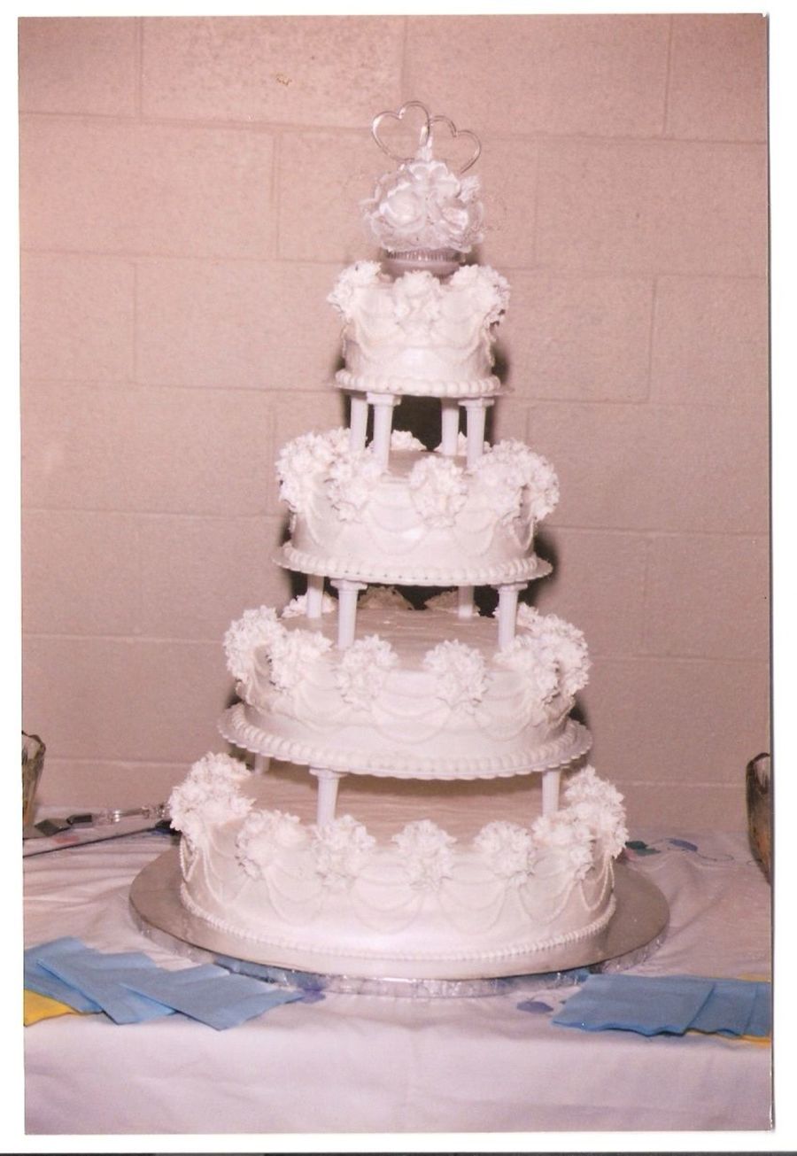My very first wedding cake ever!!! Made for my little sister to match the one in the Wilton Wedding Cakes book from a few years ago. Buttercream with nearly 500 lily-like flowers in royal icing. I had some problems with bulging between the layers, but overall I was happy with the end result. It looks like it's leaning a bit in the picture, but I think maybe the photographer just had one too many! It actually stood straight and tall to my great relief!!