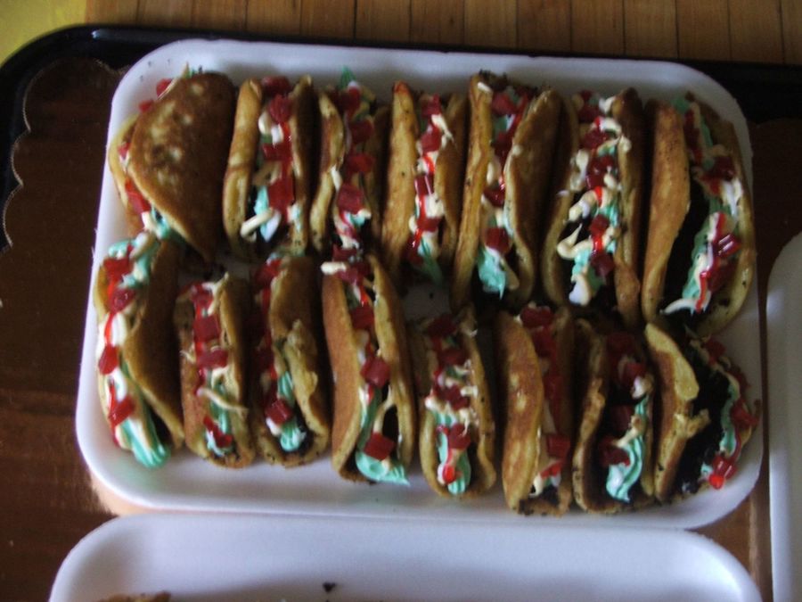 I made this Little Cakes for a Celebration. I loved making them as much as everyone enjoyed eating them. They are made out of yellow cake mix cooked up like pancakes and wrapped in parchment for the shape to stay, chocolate cake mix is the meat which I just made them like pancakes also but then I chopped up in the food processer to get the crumbled meat look. Tomatoes are cherry licorice bites cut up. Next time I make them I am going to color coconut green for the lettuce, nd keep the cheese frosting.