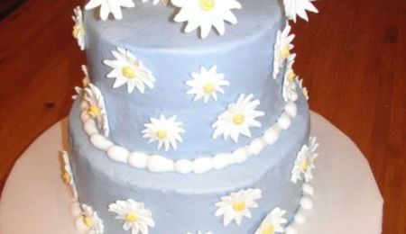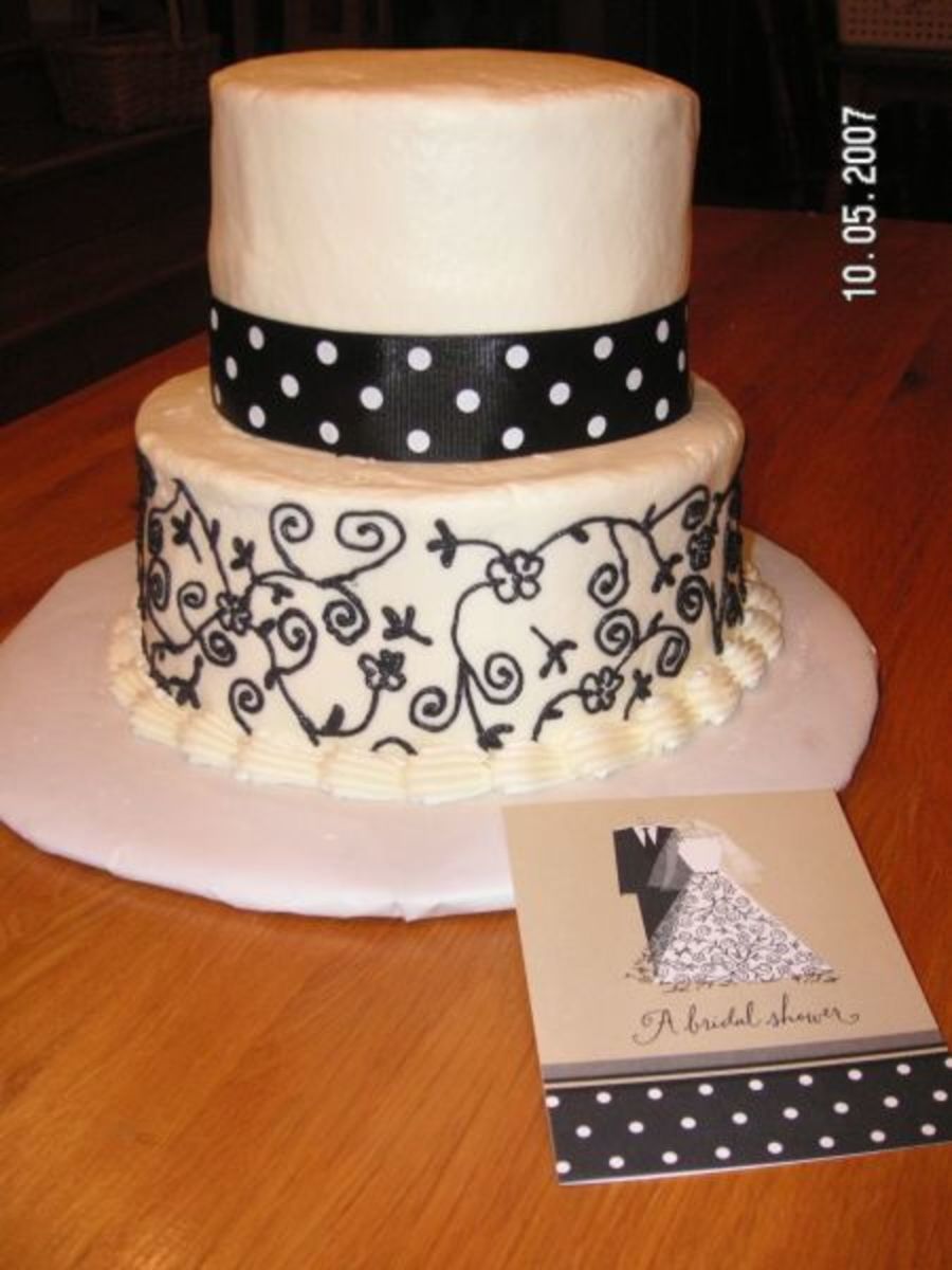 I did this cake for my SIL's bridal shower to match the partyware. It could have been smoother, but when you don't start decorating until 9pm, you have to take what you can get. I had also wanted to use the idea I've seen here of a mannequin on top, matching the dress on the invitation, but I really didn't have the desire once I finished the cake.