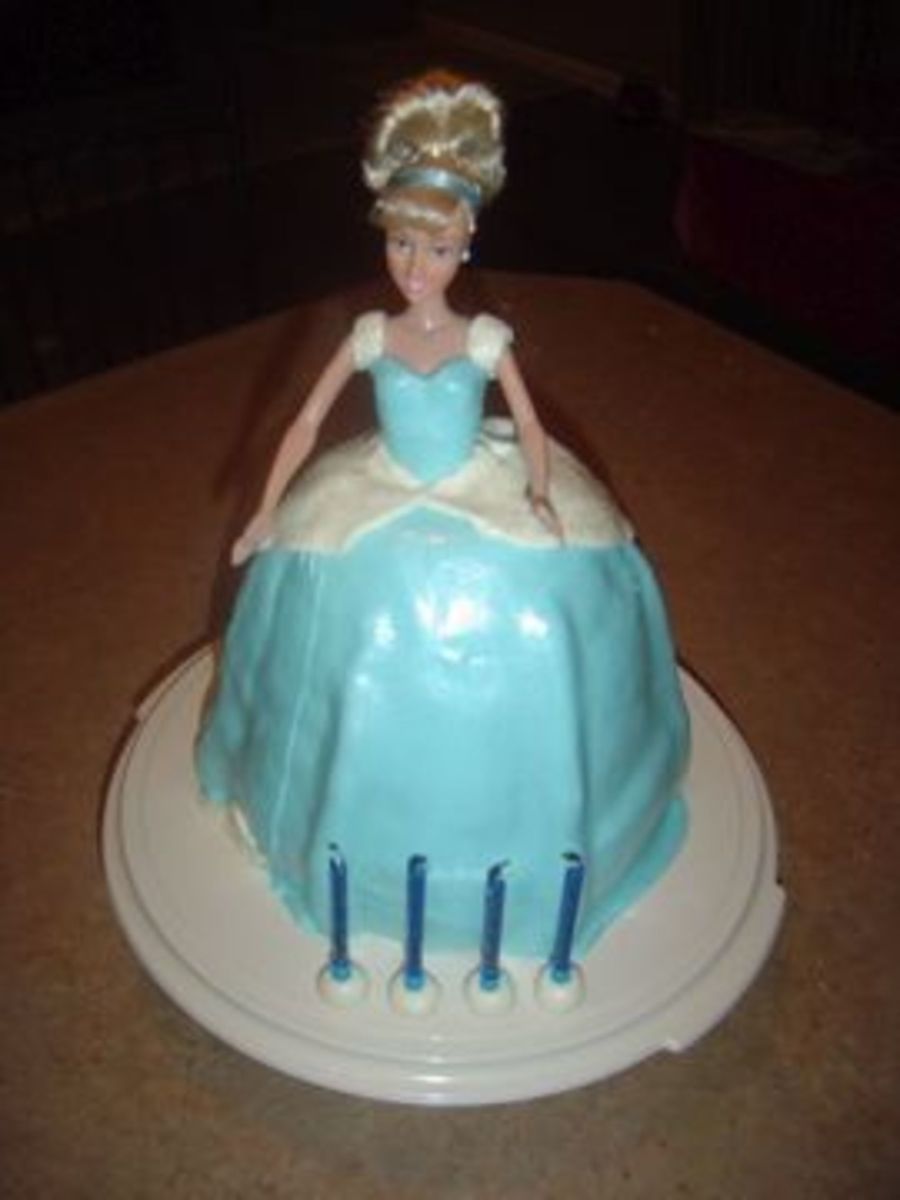 This is a strawberry cake covered in mmf. The dress has pearl dust and edible cake sparkles to add shimmer. This is my first doll cake and I made it using my Pampered Chef Batter Bowl and an 8" round that was 3" deep.