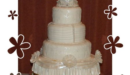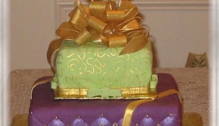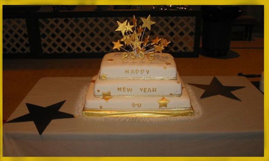Happy New Year cake covered in white fondant. Stars on top made in run sugar and then painted with Gold luster dust. Stars attached to the cake are made in fondant, then painted. Number 2005 made in run sugar also.