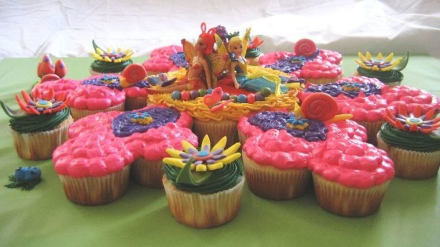 Cupcake cake made to look like a flower with fairies and fondant decorations.