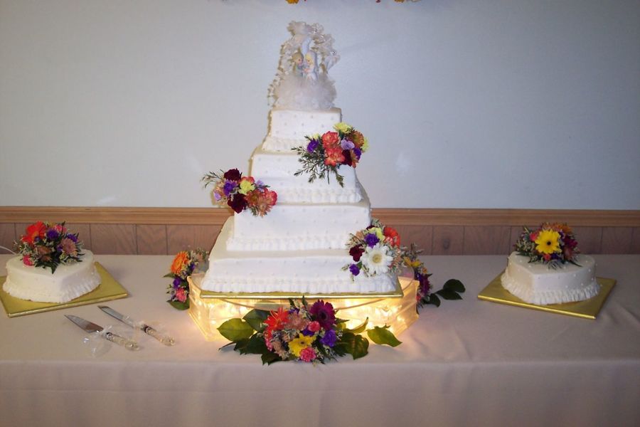 This is a beautiful cake! The design is simple and beautifully enhanced with fresh flowers. I've always liked fresh flowers on a wedding cake. I also like the lighted stand. Great job!!!