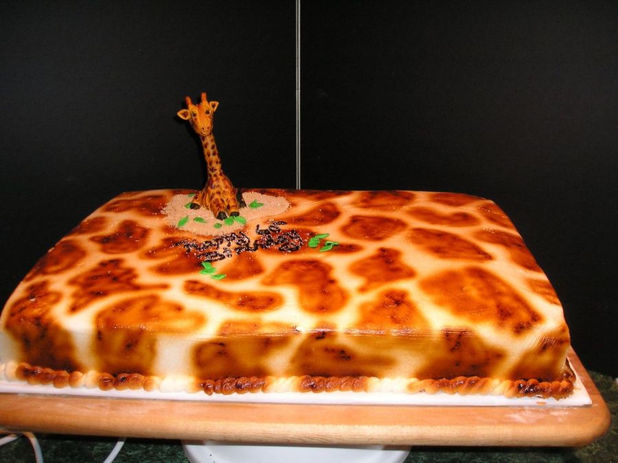 12X18" 1/2 yellow and 1/2 chocolate -torted and filled with bc. covered in bc and texturised to look like fur, airbrushed spots and a gumpaste model giraffe