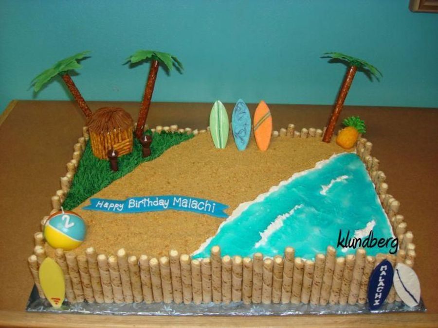 Hawaiian beach birthday for a good friend's son. I was so happy with how it turned out! Palm trees are pretzle rods and fondant and chocolate to hold it together. Surf boards are from a chocolate mold. Tiki hut is cupcakes and pretzles. Inspired by Deana (overall cake design) and Tweedie (hut and torches).