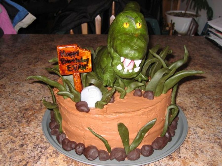 I made this for my boyfriend's son... The cake itself is chocolate with chocolate buttercream frosting. The t-rex is made of Rice Krispie treats, molded into shape while still warm and covered in chocolate clay (my new favorite accent!). The sign and "5" rock are made of gumpaste and all decorations are chocolate clay.