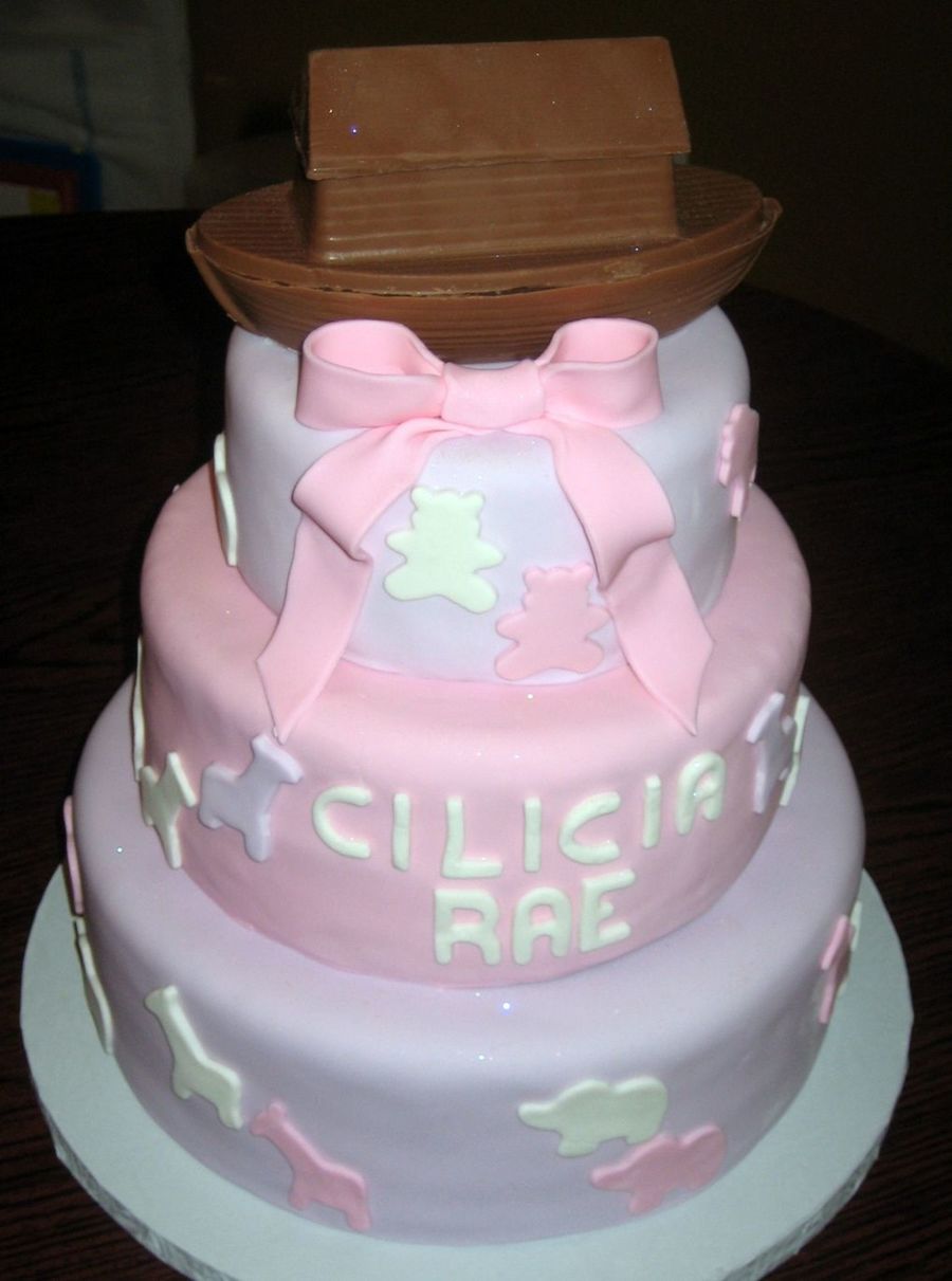 This was a baby shower cake where the mother-to-be was using Noah's Arc as her theme but wanted the cake to be girly.The arc was make using a 3-D chocolate mold and the rest of the cake is entirely fondant.