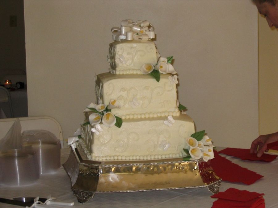 all buttercream with gumpaste calla lillies and butterflies. cake from he**. wedding site was 1.5 hrs from home. by the time i got there the icing had gotten hot and fell off of two sides of bottom tier and two sides of middle tier. it had a raspberry filling! took 1hr 45 min to fix and set up. pulled out as first guest arrived. got to tweak bc recipe.