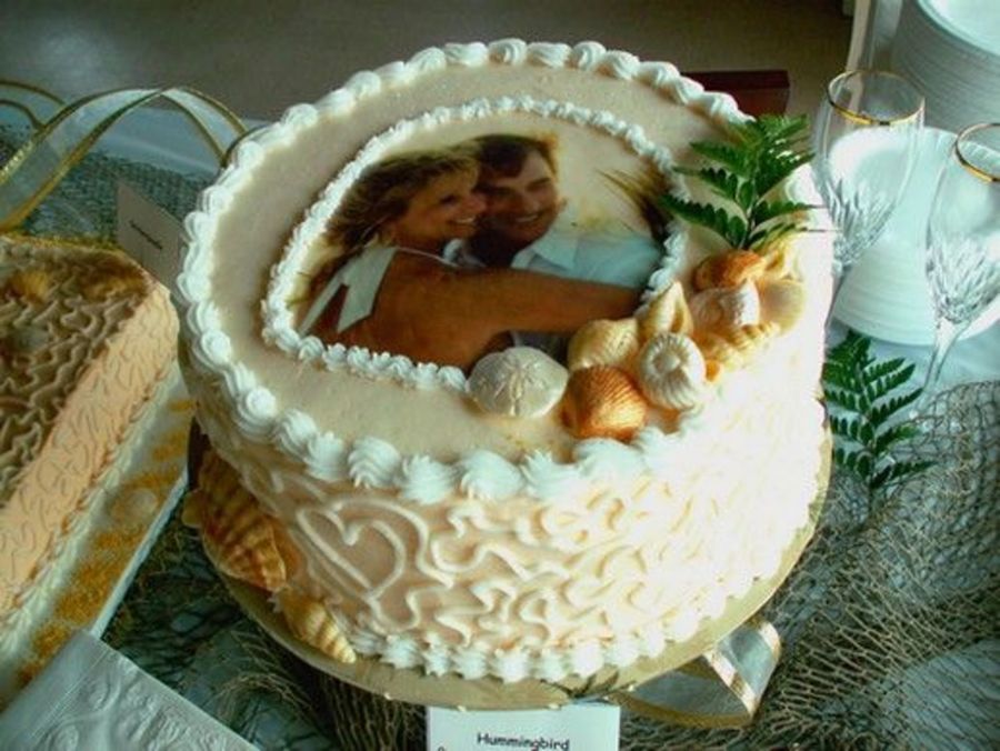 This is an edible image of one of my favorite wedding pics that I decided to put on a Hummingbird flavor, three layer cake for our reception at home. It was really impressive in it's size (hard to see how tall it really was) and it was a big hit! (Yep, this is me and my new hubby! Still happy after 56 days!) :o)