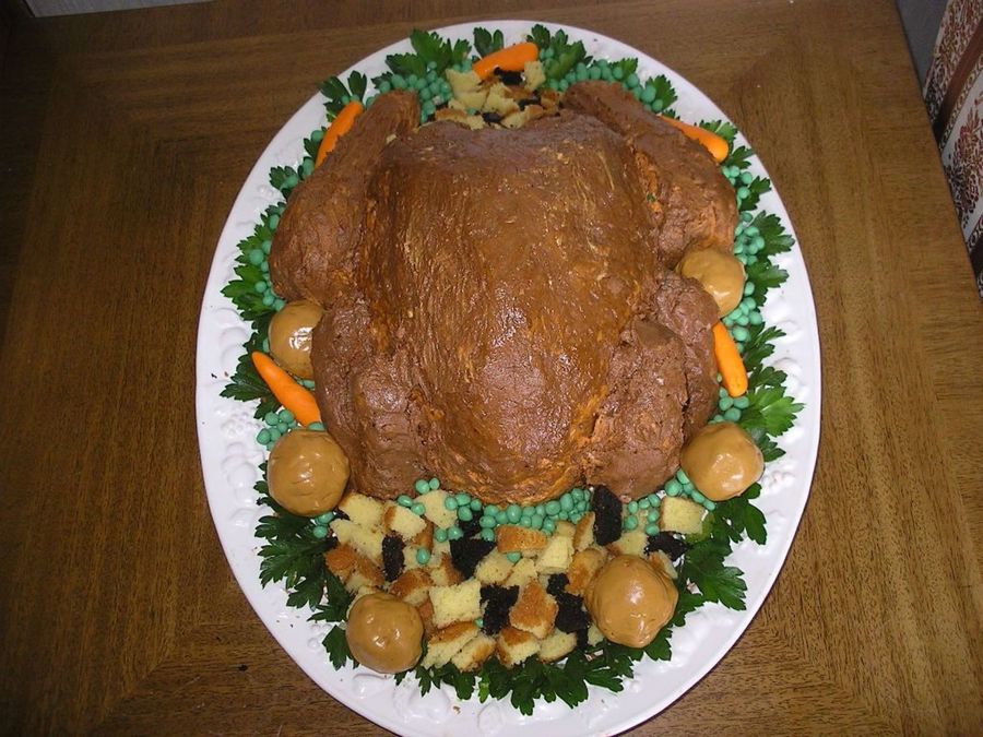 Here is yet another turkey, lol! I didn't have any special pans, I just carved the shape. Iced in buttercream. Wings and drumsticks are RK, peas & carrots are fondant, potatoes are RK covered in fondant. The parsley is real parsley, lol! Thanks for looking!