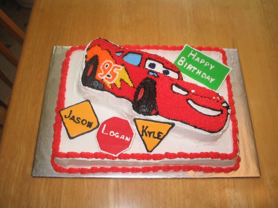 This is a birthday cake I made for my niece's boys. One has twins. They all turn 2 in October. the cakes are white with buttercream icing. The "traffic" signs are color flow.