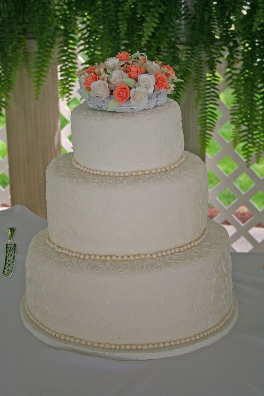Fondant wedding cake covered in white scrollwork, gumpaste flowers.