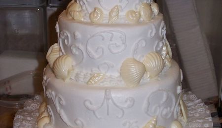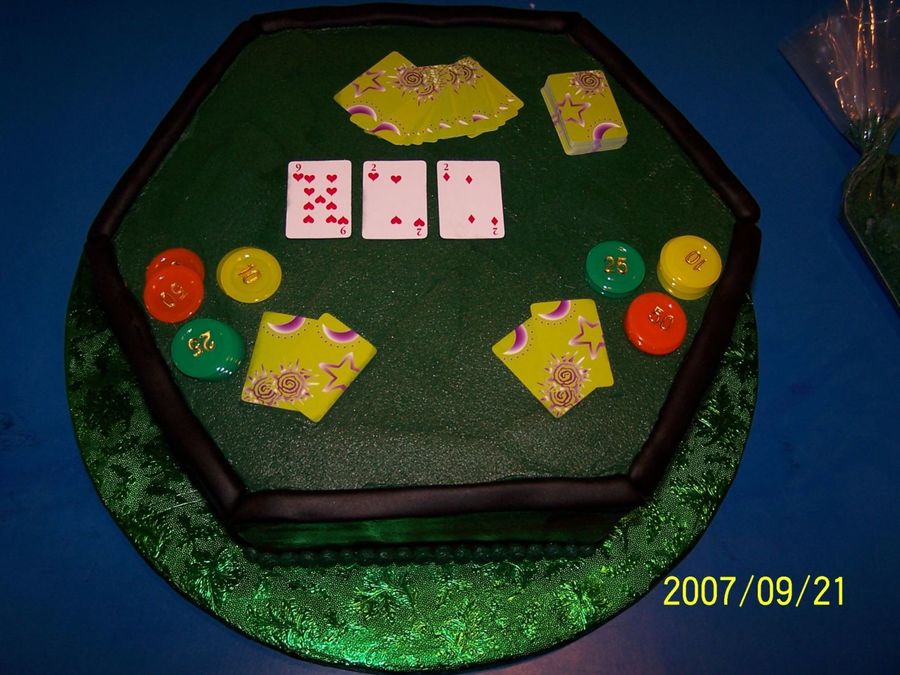 Originally a 12" round cut into a hexagon. The cake was chocolate fudge with peanut butter filling (and REALLY yummy!). Iced in buttercream with fondant accents for the top border. The flop cards represent the wedding date, Sept. 22