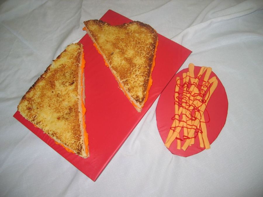 I made this cake for my grandmother who ALWAYS orders a grilled cheese sandwich no matter where she is-even if it isn't on the menu. It started out as a joke but once I started thinking about it, I had to see if I could do it. Thanks so much for the advice! It's a white cake with buttercream "cheese." French fries are fondant and gel "ketchup." I "grilled" it by buttering the top, sprinkling it with sugar, and setting it under the broiler on low and watching it like a hawk. I'm happy with the result.