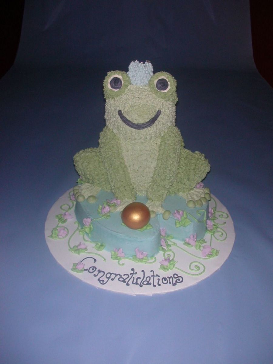 The lily pad is chocolate cake covered in vanilla buttercream. The frog is vanilla cake covered in vanilla buttercream. I used a wilton bear pan to make the frog. The bear ears are now frog eyes. The gold ball is just fondant painted with luster dust.