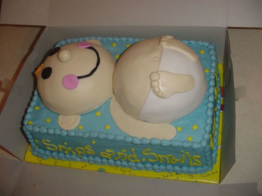 This great idea came straigh from jamiet. If only mine was as polished as jamiet's! 2 half ball cakes on top of 2-layer 9"x13". Baby covered with MMF. 9x13" covered with BC. Entire cake sprayed with luster dust.