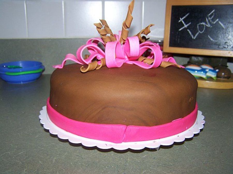 This is a chocolate cake I made for my sister-in-law's birthday. The cake is covered in fondant, with gumpaste bow and accents. Thanks for looking!