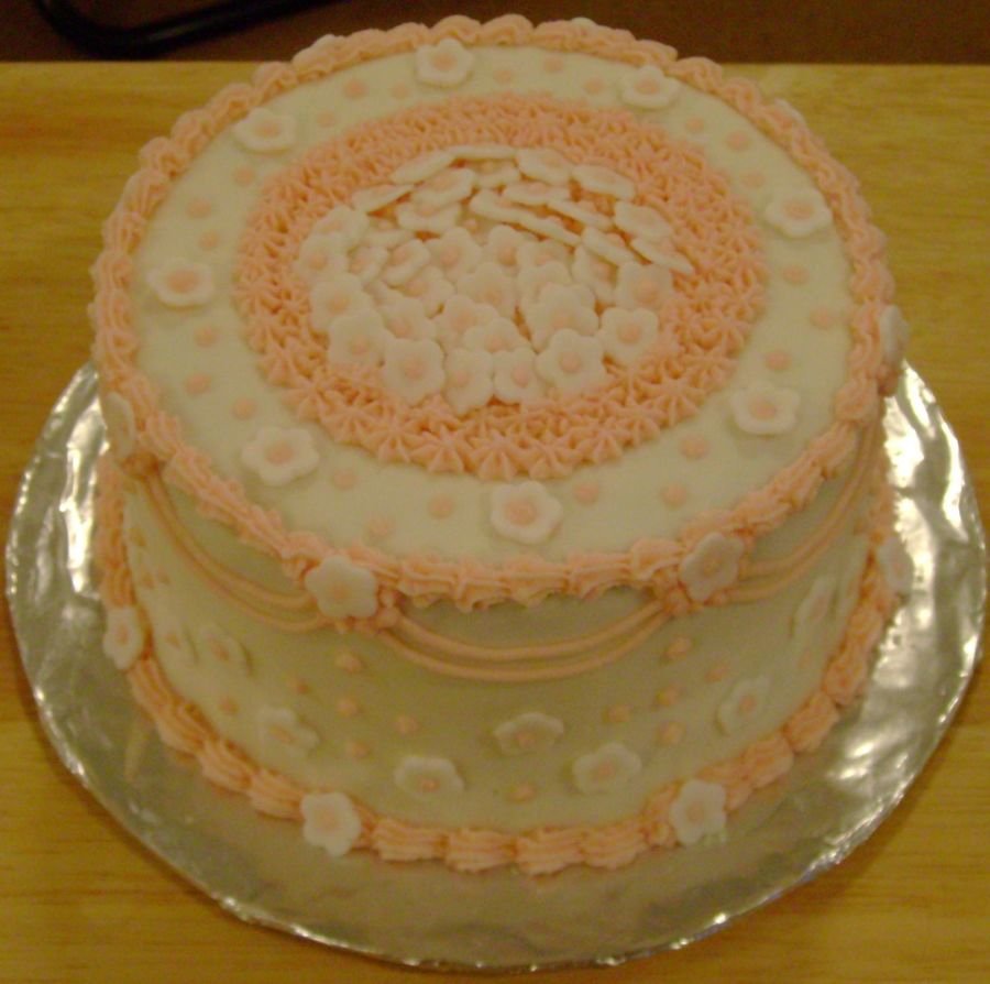 Cake dummy covered in fondant,BC decorations and fondant flowers made with a flower making set I bought that day.I made a lot of them for practice.