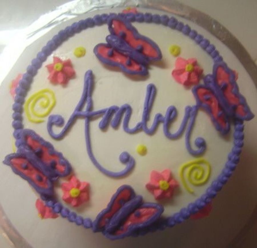 I made this cake for a college friends bday. She loves purple, butterflies and flowers...so, I got it all, right??? The butterflies are made from candy melts that I tinted. Everything else is buttercream on a 6in yellow cake.
