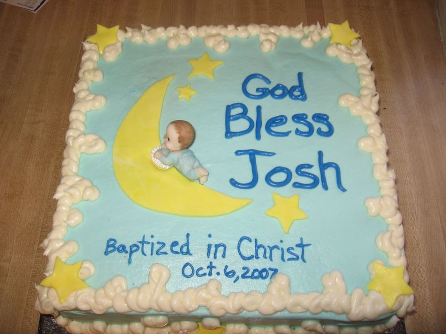 I made this for my nephew's baptism. I got the idea from Diane here at CC. THanks for sharing your cakes! It is buttercream with mmf stars and moon. The baby is a ceramic figurine. Its 14in. squared, 2 tier chocolate with raspberry filling. It was SOOO yummy. Thanks for looking.