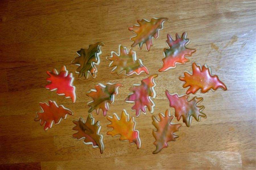 These are some of the cookies I made to take to a family reunion. I started them this evening for tomorrow so flooding or painting was out of the question! Instead, I used marbled fondant to save time. I really like the outcome. I want to thank, especially, KHalstead, for her gracious reply to my inquires and the beautiful leaves that first inspired me. This is such an awesome place to gleen ideas and everyone is so kind about sharing. These are NFSC and MMF.