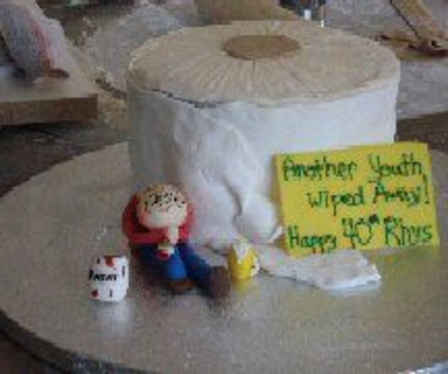 Done for my brother-in-law's 40th birthday. Buttercream icing, fondant "toilet paper" and fondant figure, paint can and pint glass.
