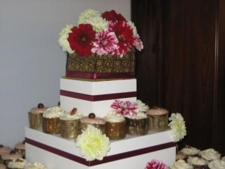 This was for a friend's wedding. My husband built the stand... it's a slightly modified version of Antonia74's instructions (thank you!). Cupcakes (120 of them) are Carrot w/ cream cheese frosting, lemon filled with raspberry and chocolate filled with carmel mousse and nutella buttercream. The cake on top is a 5" square covered in a chocolate wrap to match the panettone wrappers that the cupcakes were in. All flowers are fresh and they really made it complete. Thanks for looking!