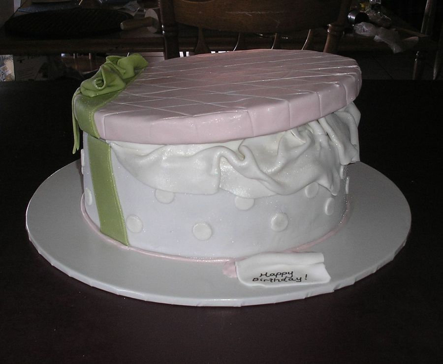 first attempt at a hat box. I made the bow very last minute and it didnt have time to dry, hence why it is totally wilted! I stacked a smaller hat box with a gumpaste shoe on top of this box also.
