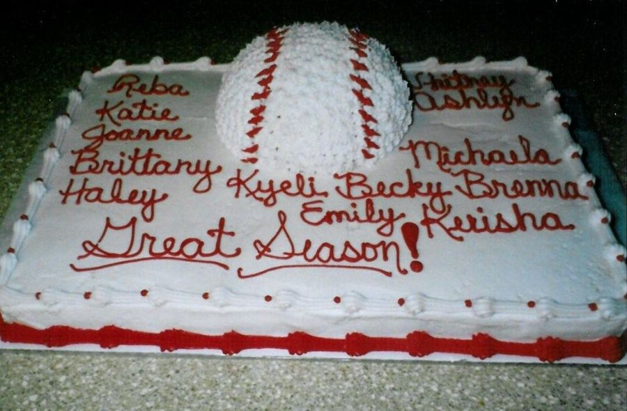 8O Your handwriting is awesome!! Great cake, love that softball on top, and sweet job on the borders :D