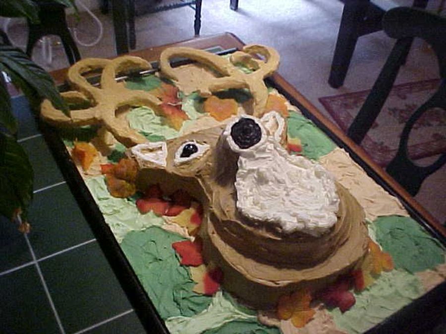 Boy, this one needs a lot of changing. I needed to do his antlers in royal icing and stupid me used buttercream and his nose is all wrong, crooked eyes..the only thing I half-way like is the back board... lol. Luckily it was just practice.