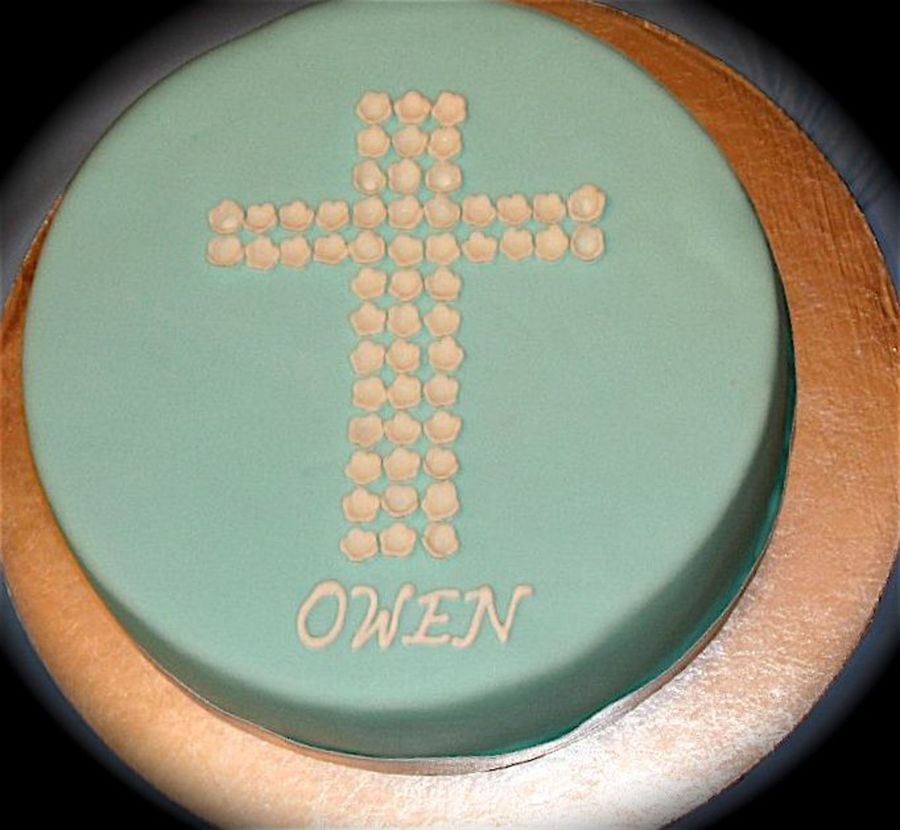Tiffany blue fondant with gumpaste flowers in a cross formation.