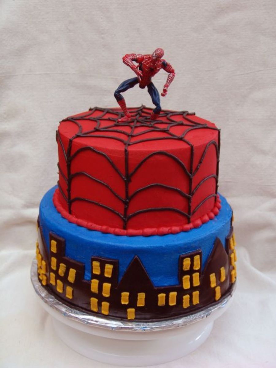 This is a cake I made with the inspiration from _ChristyB_. The bottom is a 10" round and the top is a 8" round. It's all covered in buttercream, and the buildings are fondant.