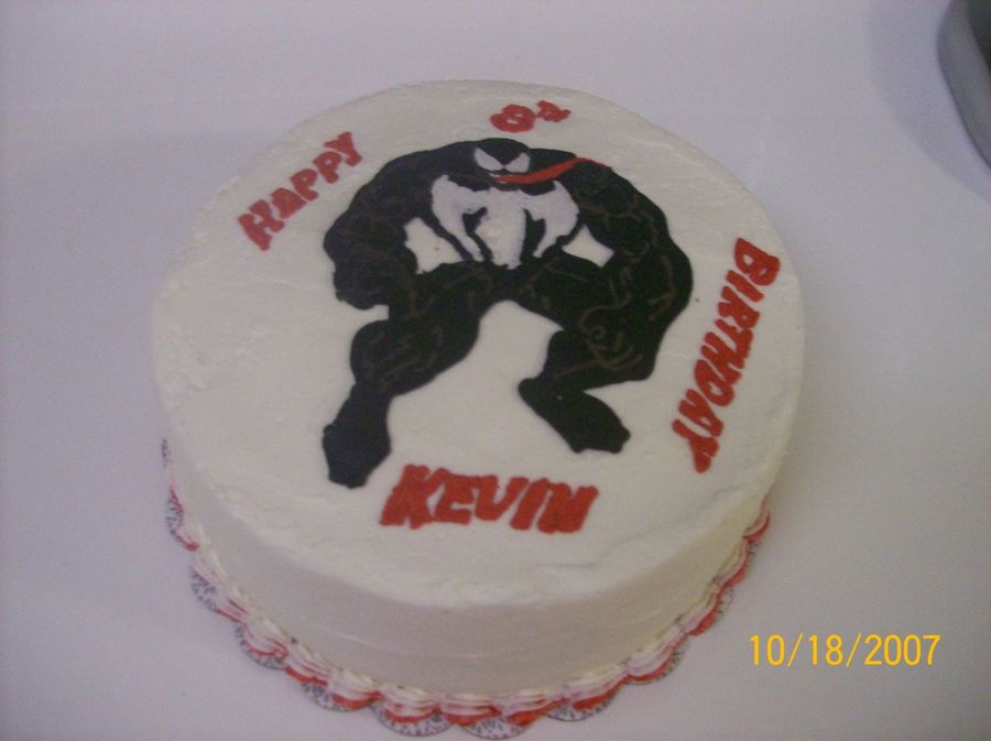 I made this Venom cake last night for my son's b-day tomorrow. He wanted a four-layer marble cake w/ raspberry filling. Buttercream Venom.