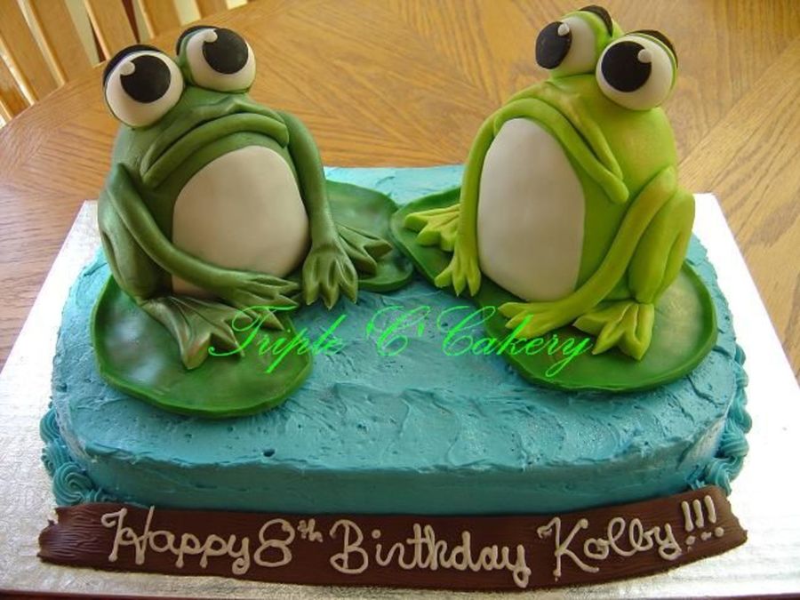 9x13 base cake iced with IMBC. Frogs are made in the mini wondermold pan, iced wth IMBC and covered with fondant. Frogs copied after ones made by DaisyMakesCakes in the UK.