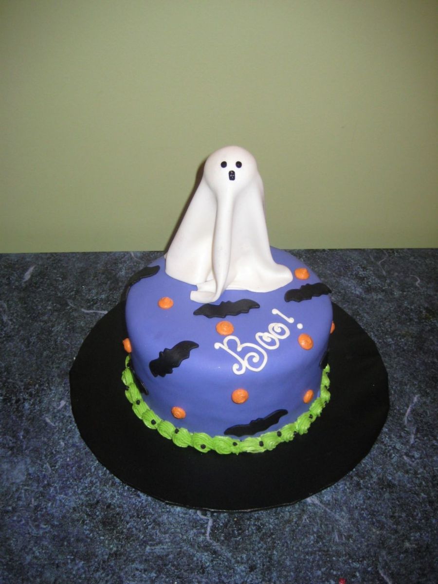 I got this idea from several cakes i saw in the gallery. The cake is vanilla w/ vanilla buttercream and fondant. The ghost is a ball of fondant on a skewer with a fondant sheet draped over. The cake is for our school's bingo night. thanks for checking it out!